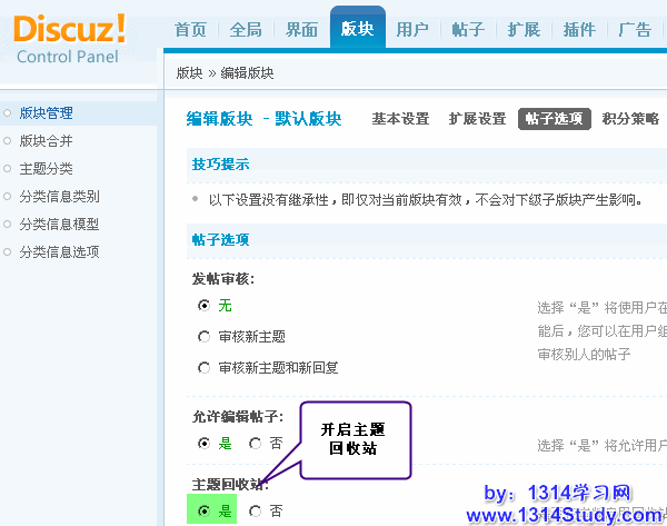 需要注意的是这个功能需要在 Discuz! 后台开启才可以,首先这个功能是跟每个版块关联的,所以每个版块都有此项设置,即可以控制哪些版块开启主题回收站的功能。在版块 => 版块管理 => 编辑要开启主题回收站的版块 => 帖子选项中,就可以设置这个版块开启或者关闭回收站。如下图所示: