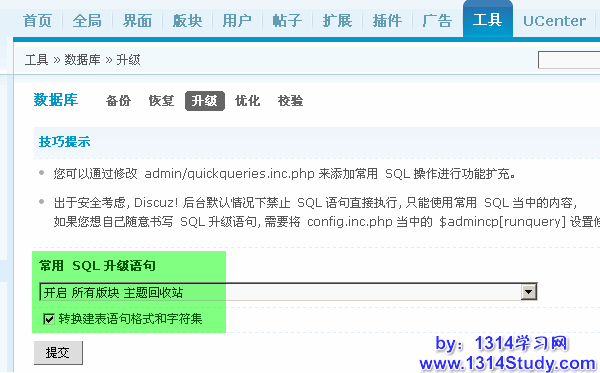 如果版块太多,一个一个版块开启太麻烦的话,还可以到工具 => 数据库 => 升级的“常用 SQL 升级语句”里面选取“开启所有版块主题回收站”。如下图所示:
