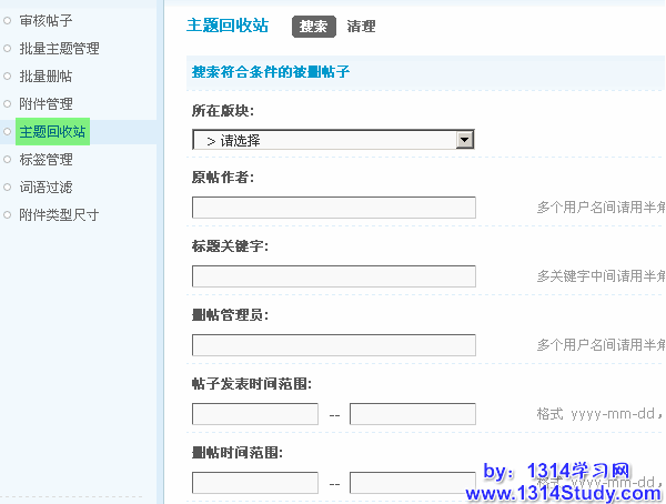 根据这些条件,可以搜索到主题回收站里的帖子,全部留空的话就是显示所有回收站内的帖子。如下图所示: