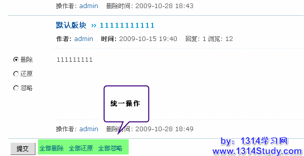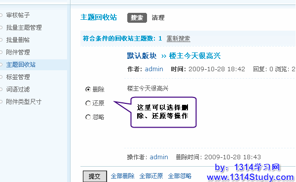 那接下来就是如何管理主题回收站里的帖子了。管理也是非常的简单快捷。