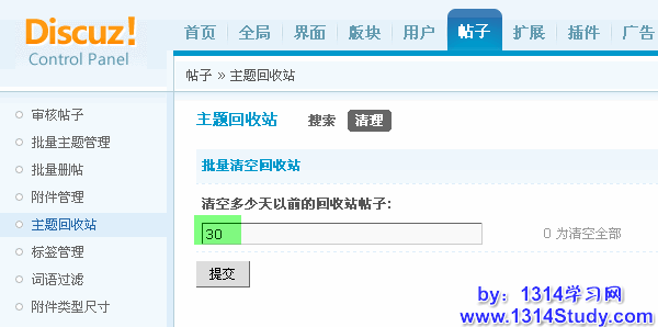 当回收站里面存在大量垃圾帖子的时候,还有个更快捷方便的操作可以批量清空回收站里的帖子,这个就是“批量清空回收站”功能。可以在后台 => 帖子 => 主题回收站 => 清理找到这个功能。只需要填写一个清空的时间,就可以方便快捷的清空多少天以前的回收站的帖子了,填 0 为清空全部的帖子。如下图所示: