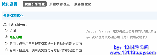 Discuz! Archiver 能够将论坛的内容模拟成静态页面,以便搜索引擎获取其中的内容。如上图中所示,启用 Archiver 有4个选项,如果选择“关闭”则论坛不启用 Archiver,如果选择“完全开启”,则会在论坛的右下角显示 Archiver 的链接。