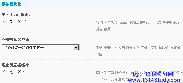 论坛后台的全局 => 优化设置可以分别进行“搜索引擎优化”、“页面缓存设置”以及“服务器优化”来优化论坛的运行。