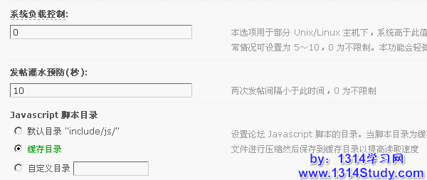 设置论坛 Javascript 脚本的目录。当脚本目录为缓存目录时,系统会将默认目录中的 *.js 文件进行压缩然后保存到缓存目录以提高读取速度。
