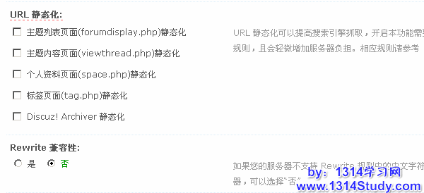 URL 静态化设置中还包括一个“Rewrite 兼容性”设置,这个设置主要是在开启了 tag.php 页面静态化的时候处理一些中文 tag 避免不兼容的情况出现。