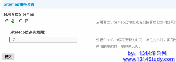 设置 SiteMap 缓存更新的时间,单位为小时。数值设置为 1~24,建议单位更新时间内论坛新增的主题数不要超过 500。