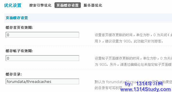 如果该设置设置为 0 的话,那么帖子缓存关闭。如果设置为其他值比如 900 则论坛每 900 秒来读取数据库信息更新一次帖子缓存,保证缓存信息与实际信息的同步。另外,请通过编辑论坛来指定帖子页面缓存系数。
