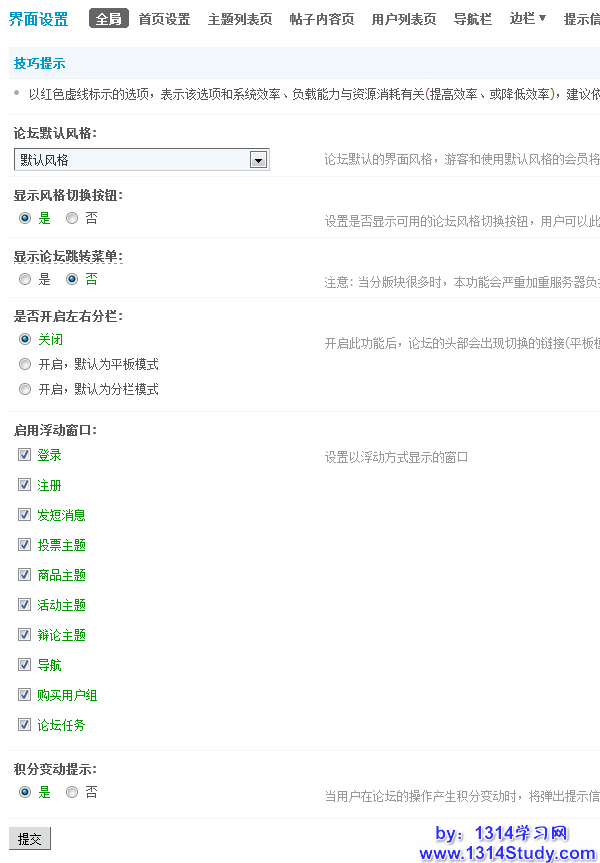 可以在“全局”里设置网站默认风格、是否开启左右分栏、是否启用浮动窗口等等,具体看下面的详细讲解。
