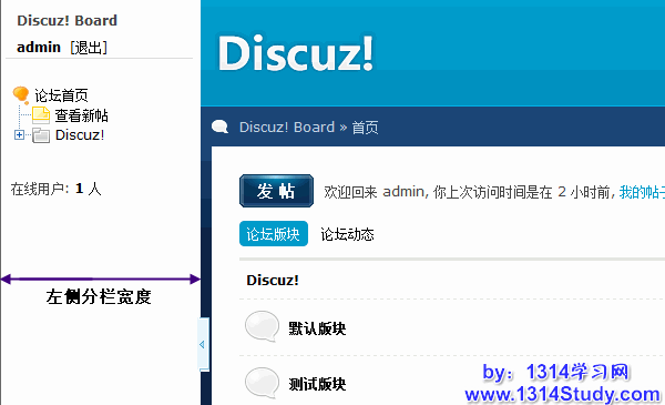 另外还可以设置左侧分栏的宽度:请根据您论坛版块名称的长度设置适当的宽度,推荐宽度 180。