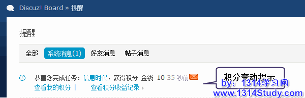 当用户在论坛的操作产生积分变动时,将弹出提示信息告知用户: