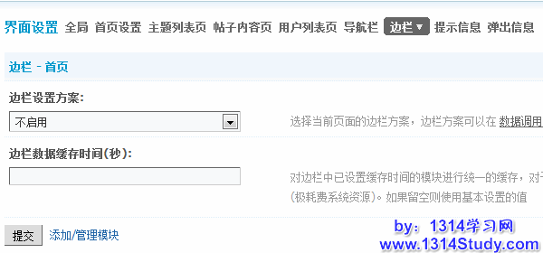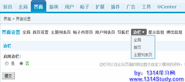 下面我们先在“全局”里开启边栏,上图界面中“启用边栏”选择“是”,然后“提交”。