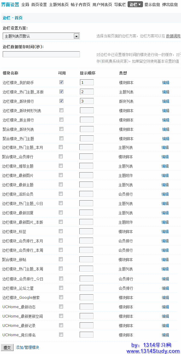 “主题列表页默认”是为主题列表页默认设置的一套边栏设置方案,选择后系统会列出默认自带的一些模块可供选择,其中“边栏模块_我的助手”、“边栏模块_热门主题_本版”、“边栏模块_版块排行”三个模块是默认选中的,您可以根据自己的需要启用各个模块,如下图所示: