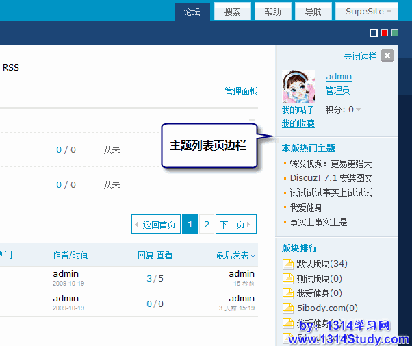 我们为“主题列表页”添加边栏,边栏设置方案选择“主题列表页默认”,然后提交,返回主题列表页看下效果: