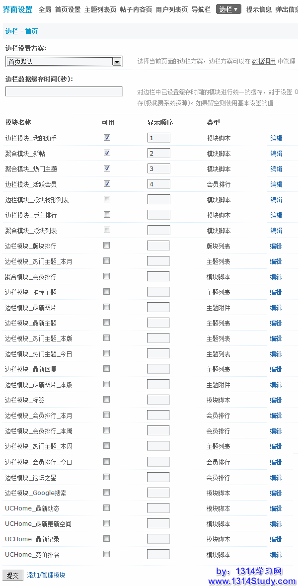 “首页默认”是为首页默认设置的一套边栏设置方案,选择后系统会列出默认自带的一些模块可供选择,其中“边栏模块_我的助手”、“聚合模块_新帖”、“聚合模块_热门主题”、“边栏模块_活跃会员”四个模块是默认选中的,您可以根据自己的需要启用各个模块,如下图所示: