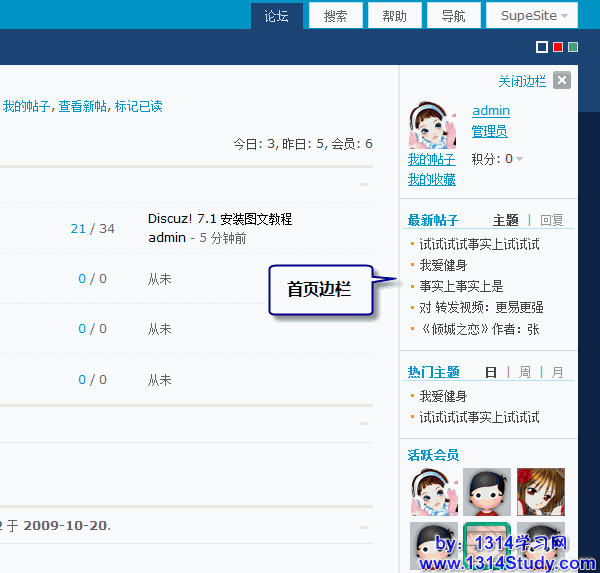 登录 Discuz! 7.1 => 系统设置 => 界面 => 界面设置 => 边栏:
