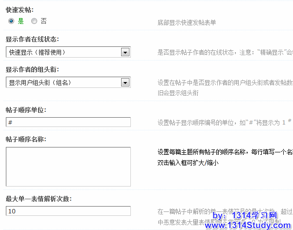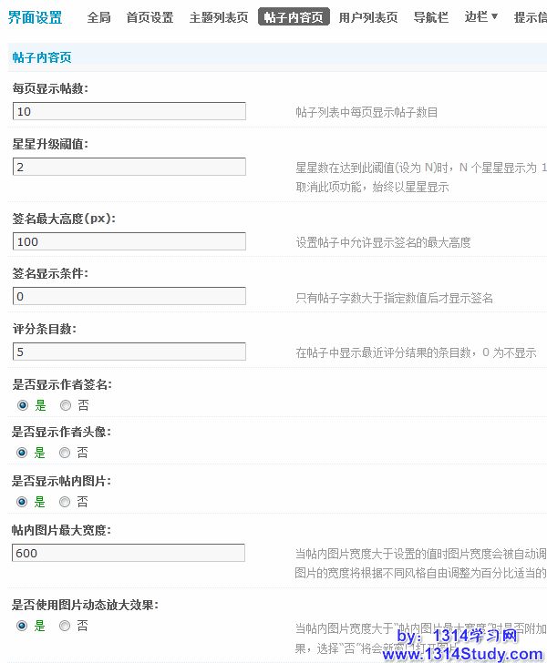 这部分的设置针对帖子内容页的显示,下面我们一一讲解。