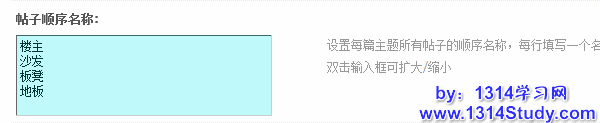 设置每篇主题所有帖子的顺序名称,每行填写一个名称,第一行代表主题帖,第二行代表主题的第一个回复,以此类推。双击输入框可扩大/缩小。