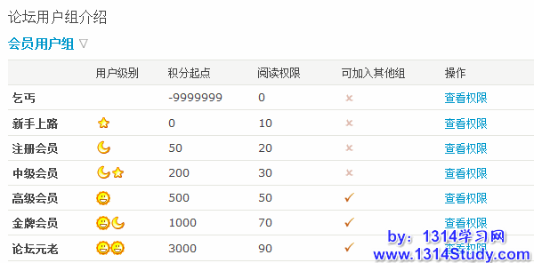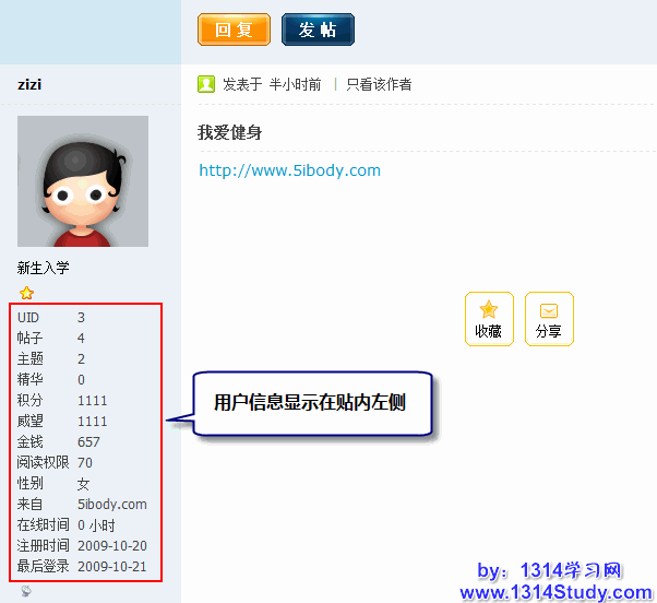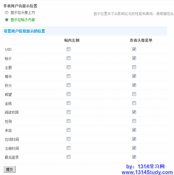 可选择设置显示位置的用户信息有:UID、帖子、主题、精华、积分、威望、金钱、阅读权限、性别、来自、在线时间、注册时间、最后登录。