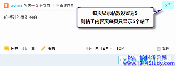 帖子列表中每页显示帖子数目,比如设置为 5 则帖子内容页除了显示主题外还显示 4 个回复,更多回复会分页显示,每页显示 5 个。