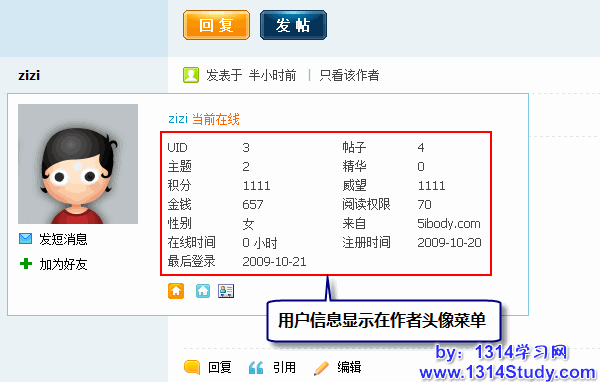可供用户信息显示的位置有:贴内左侧、作者头像菜单。