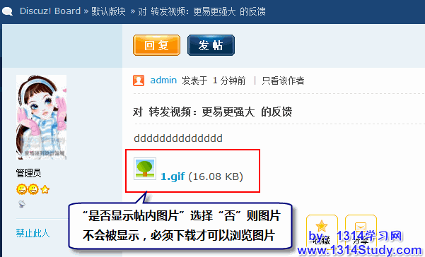 设置是否显示贴内的图片,如果选择“否”,则不显示帖子里的附件图片,必须要点击下载后才可以浏览图片: