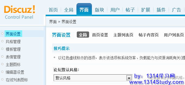 界面设置功能是针对论坛的前台显示效果有关的一系列设置,包括网站风格显示和各个模块显示方式的设置,包括全局、首页设置、主题列表页、帖子内容页、用户列表页、导航栏、边栏、提示信息、弹出信息 9 项设置,下面一一讲解。