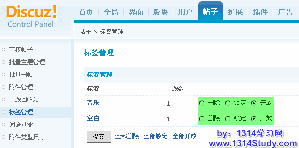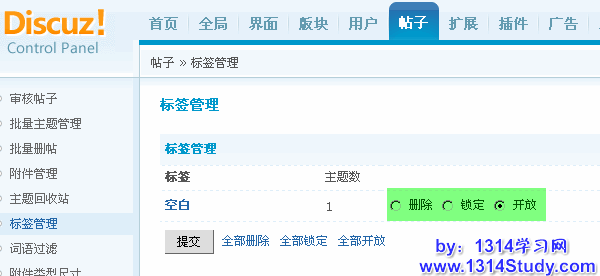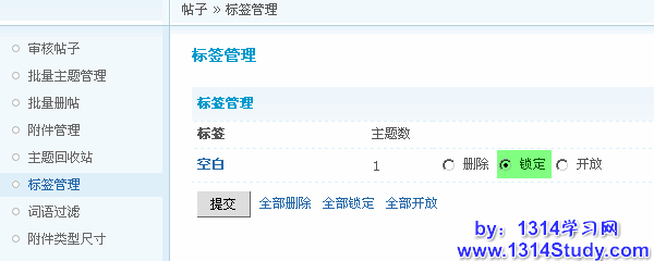 管理员既可以使用单选按钮逐一修改标签状态,也可以使用提交按钮右侧的“全部删除”、“全部锁定”、“全部开放”来批量修改标签状态。