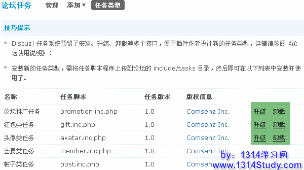 Discuz! 7.1 自带了五种任务类型:论坛推广任务,红包类任务,头像类任务,会员类任务和帖子类任务。您可以升级或卸载任务类型,还可以自己添加任务类型。