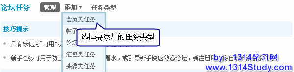 站长可以在后台添加论坛任务,目前可以添加的任务类型有:论坛推广任务,红包类任务,头像类任务,会员类任务和帖子类任务。