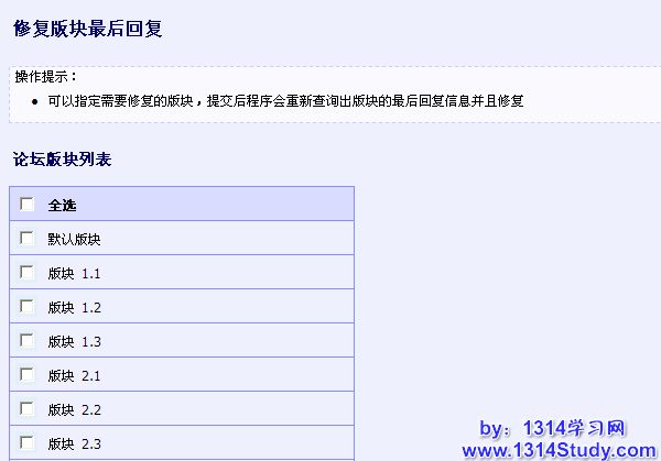 有的时候会碰到发帖机来论坛发大量的广告帖子,管理员在后台批量删除这些帖子后,数据库中有些冗余的数据没有清理掉导致版块的最后回复还是广告贴的信息,此时可以利用此功能修复,注意备份数据。