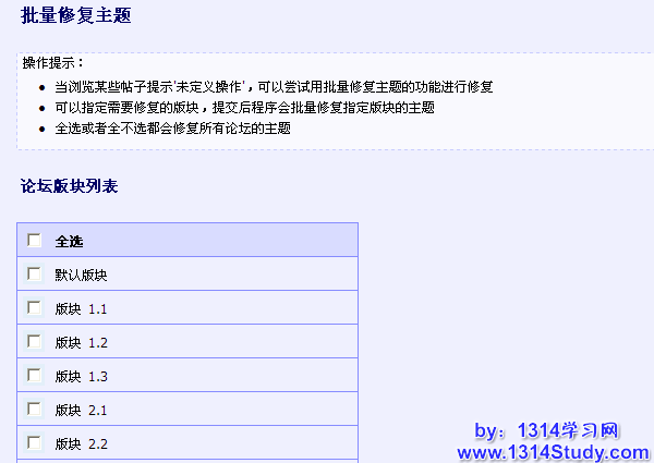 有的时候会碰到发帖机来论坛发大量的广告帖子,管理员在后台批量删除这些帖子后,数据库中有些冗余的数据没有清理掉导致版块的最后回复还是广告贴的信息,或者当浏览某些帖子提示'未定义操作',可以尝试用批量修复主题的功能进行修复,注意备份数据。