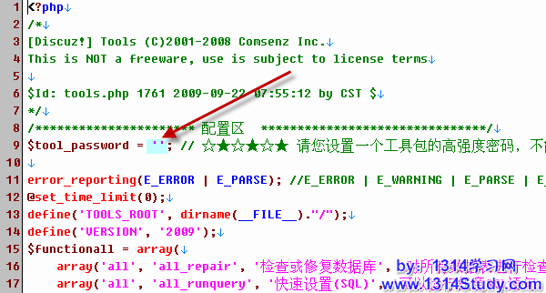 把 Tools 工具箱下载回来后,用记事本打开,在第 9 行可以找到设置密码的地方,在下图所指的地方输入你要设置的密码,然后FTP传输到论坛或者其他康盛产品的根目录下,通过浏览器访问 Tools 工具箱就可以使用了。