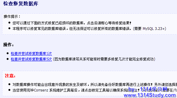 2)本程序可以修复常见的数据库错误,但无法保证可以修复所有的数据库错误。(需要 MySQL 3.23+)