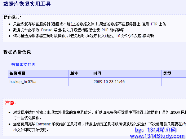 可以导入论坛等 Comsenz 产品备份的数据库,可以避免在论坛后台恢复的时候因为管理员密码不同而跳出后台的问题,此处的导入备份数据与 UCenter 后台备份恢复效果一致。