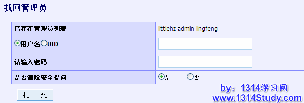 此功能可以帮助站长找回遗忘的管理员,如果应用和 Ucenter 的通信方式是基于 MySQL 进行的,在这个页面就可以完成管理员权限的提升、密码的更改、安全问答的去除等。