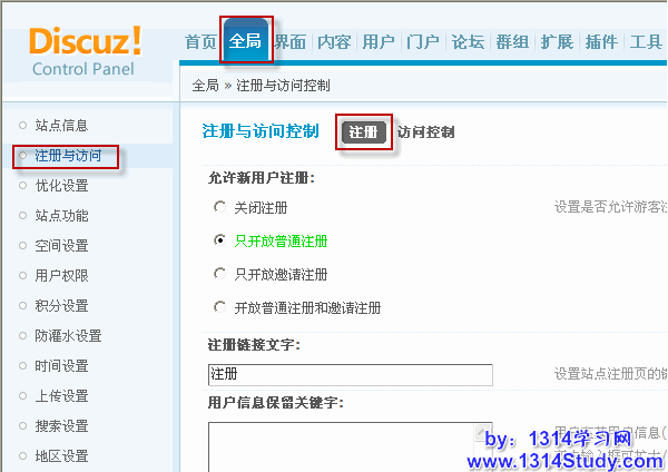 一、注册相关设置:进入后台 => 全局 => 注册与访问 => 注册,如下图所示:
