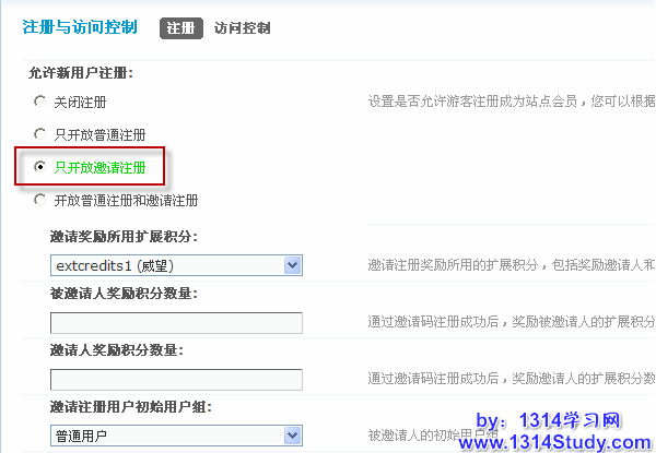 3)只开放邀请注册:只允许持有邀请码的新用户注册,此时需要进行邀请的相关设置。如下图所示: