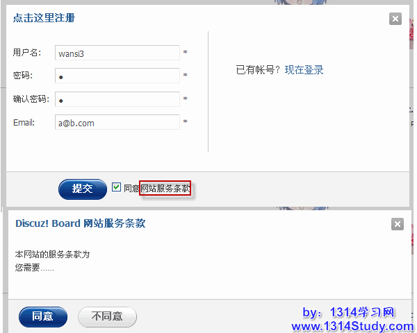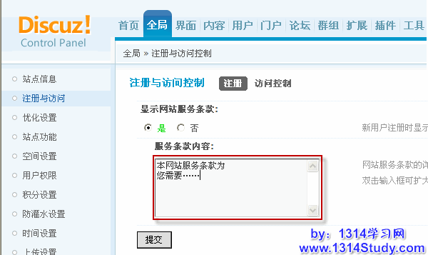 12、显示网站服务条款:选择“是”,需要进一步设置服务条款的详细内容,新用户注册时显示网站服务条款,只有同意网站服务条款,才能完成注册。如下图所示: