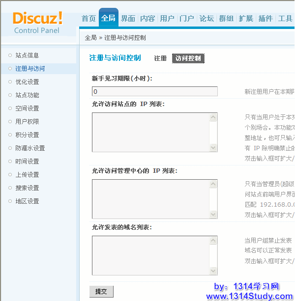 二、访问控制相关设置:进入后台 => 全局 => 注册与访问 => 访问控制,如下图所示: