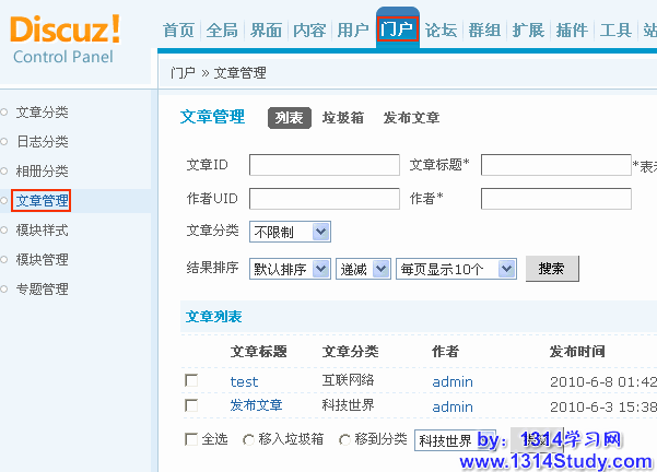 搜索文章:这里可以根据文章ID、文章标题、作者UID、作者、文章分类和结果排序进行搜索。