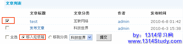 移入垃圾箱:把想要删除的文章移入垃圾箱,选择好要删除的文章,直接移动到垃圾箱即可,如下图所示: