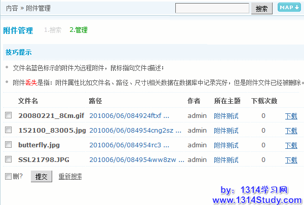 附件的管理,主要包括附件的删除、下载、查看附件所在主题。当按查询条件提交以后,会看到类似下图所示的搜索结果: