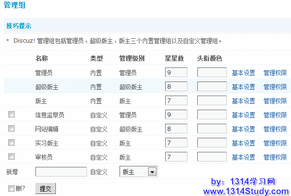 Discuz!X 管理组包括管理员、超级版主、版主三个内置管理组以及自定义管理组,除管理员组以外,其他管理组均可详细设置管理权限。