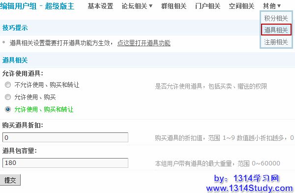 1)允许使用道具:是否允许使用道具,包括购买、使用、转让的权限。