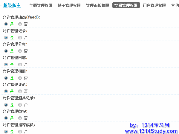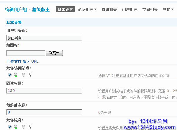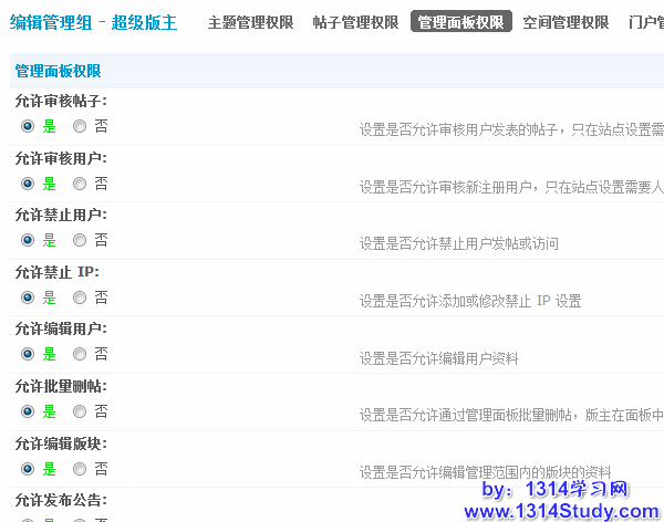 下面以超级版主为例,讲解一下管理组的各项设置。