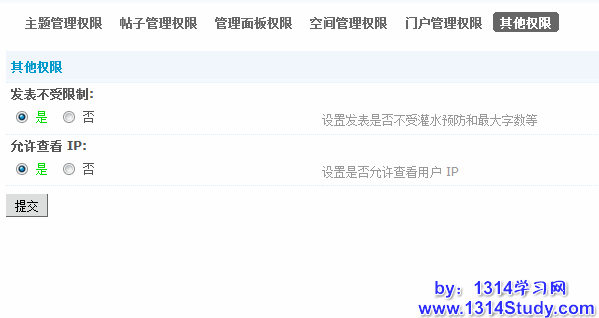 1)发表不受限制:设置发表是否不受灌水预防和最大字数等。