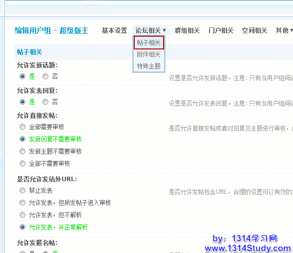 1)允许审核帖子:设置是否允许审核用户发表的帖子,只在站点设置需要审核时有效。