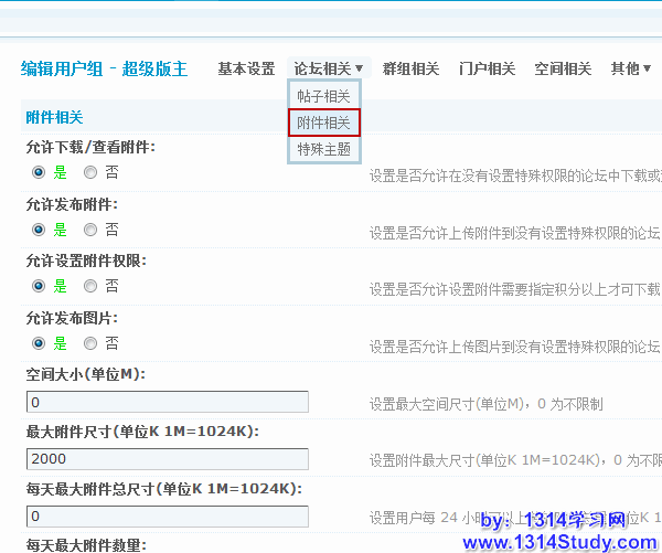2)允许发布附件:设置是否允许上传附件到没有设置特殊权限的论坛中。