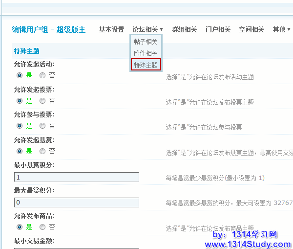 4)允许发起悬赏:选择“是”允许在论坛发布悬赏主题,悬赏使用交易积分。