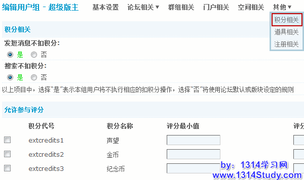 3)允许参与评分:允许该用户组用户在给其他用户评分的时候可以评哪种积分,以及可以评分的最大值与最小值,和24小时评分总量。
